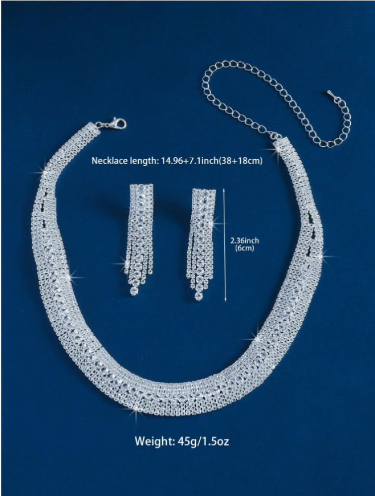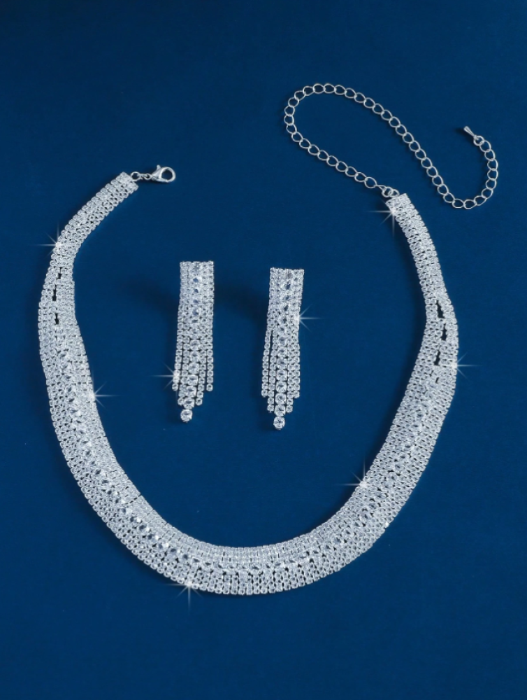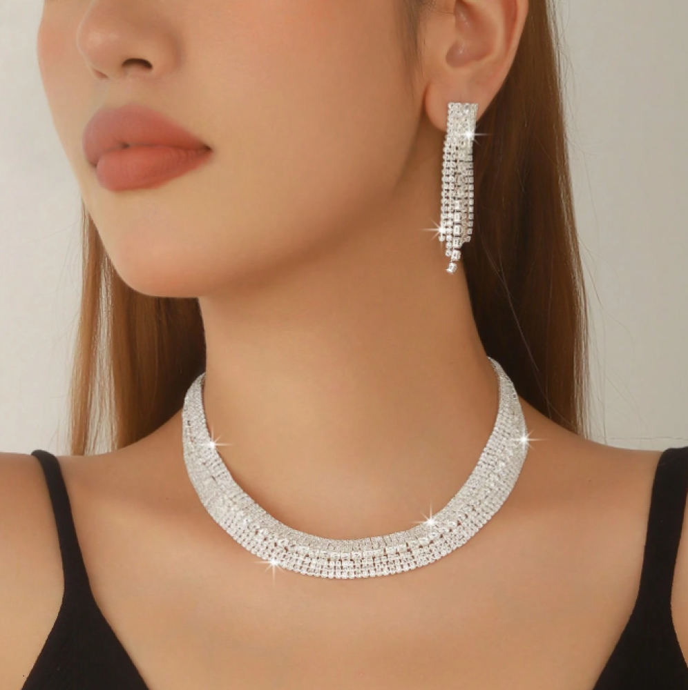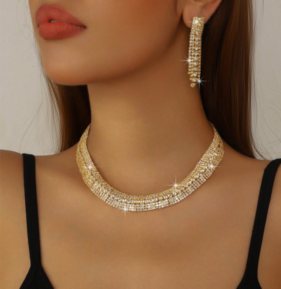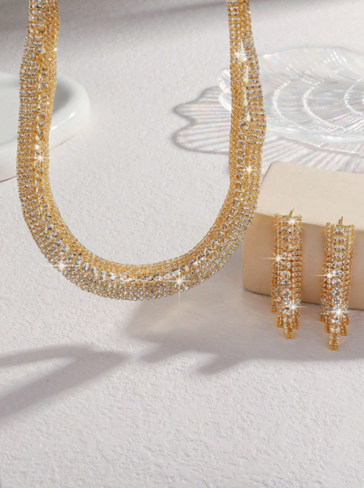 طقم قلادة وأقراط مرصع بالراين الذهبي اللامع، إكسسوارات فستان حفلة عصرية للمرأة