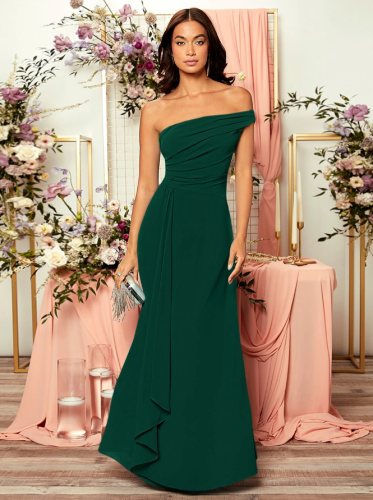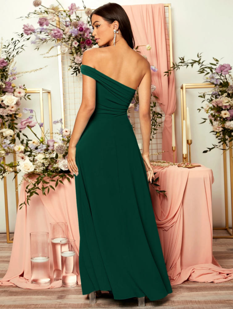 فستان سهره اخضر غامق أنيق بتصميم أنثوي فاخر، يتميز بكشكشة أمامية منسدلة تضيف لمسة درامية جذابة مثالية للراعية العروس أو الحفلات الخاصة، يمنحك حضورًا راقيًا وأناقة ملفتة بلمسة عصرية راقية.